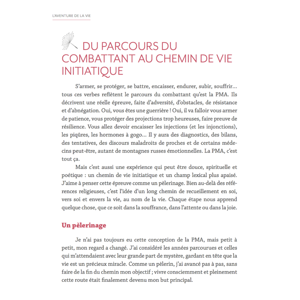 Plus qu'un guide pratique ou qu'un simple témoignage, ce livre est un outil parfait d'accompagnement symbolique et psychologique pour les femmes et les couples qui font face aux problèmes d'infertilité et prennent le chemin de la PMA
